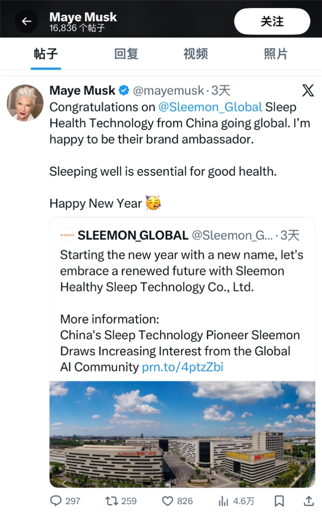 近日,一则看似普通的品牌新年祝福,在海外社交平台意外掀起一场关于“睡眠”的跨国讨论。起因是中国睡眠科技品牌喜临门于2025年12月31日在X平台(原Twitter)发布更名公告,并配文庆祝新年。这条动态被知名健康生活倡导者、梅耶·马斯克(Maye Musk)转发点赞,称:“好睡眠是健康的根本。”