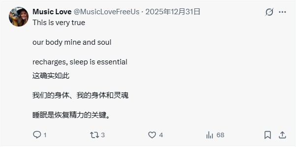 更有用户展开“睡眠哲学”探讨,一条评论思考颇具深度:“our body mine and soul,recharges,sleep is essential.”